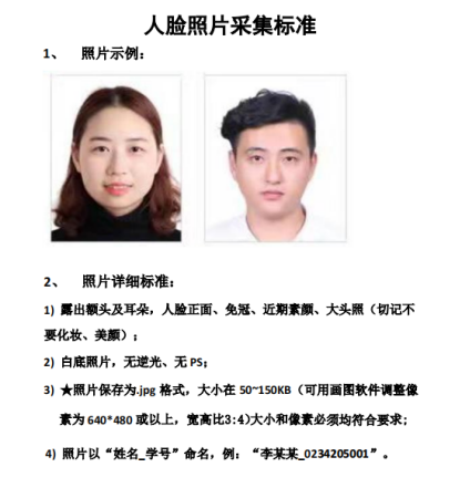 根据学校安排,校园门禁系统采用面部识别的方式予以通行,为保证大家能够正常出入,现收集人脸信息,请同学们按要求提供。因未提供电子照片或电子照片不符合要求无法进入校园参加教学活动的,按旷课处理。